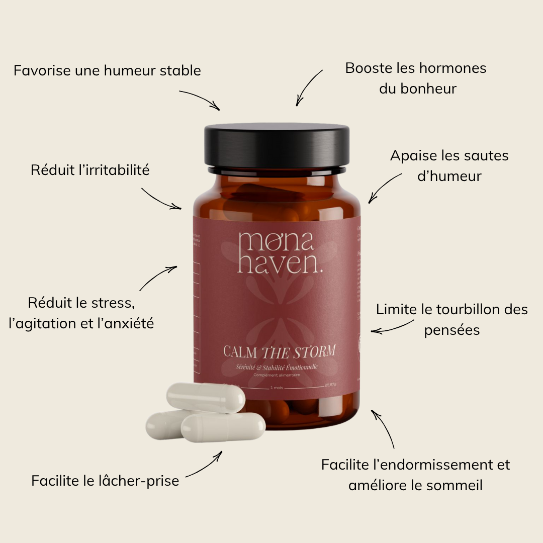 Calm the storm porte bien son nom. Il permet de réguler l'humeur lors du cycle. Depuis un mois, ce n'est plus les montagnes russes. Je n'ai plus d'excès de colère. Les sentiments sont toujours là mais plus dans l'excès. Ce produit est une pépite!